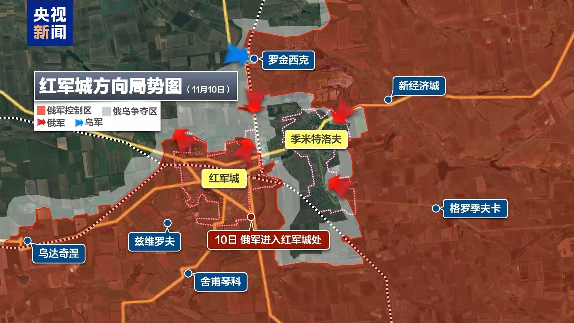俄罗斯国防部11日表示,过去24小时,俄军突击队在红军城中央区西北部、东部街区以及火车站区域持续对乌军展开攻势,控制了256栋建筑物。俄罗斯媒体认为,红军城95%的区域处于俄军控制之下。乌军被困于红军城东的季米特洛夫。俄乌双方媒体都认为,乌军若想通过地面向季米特洛夫提供补给已无可能。