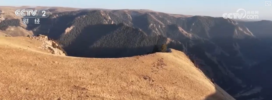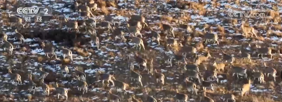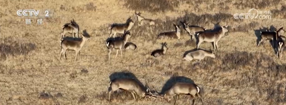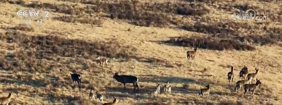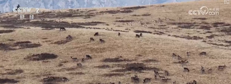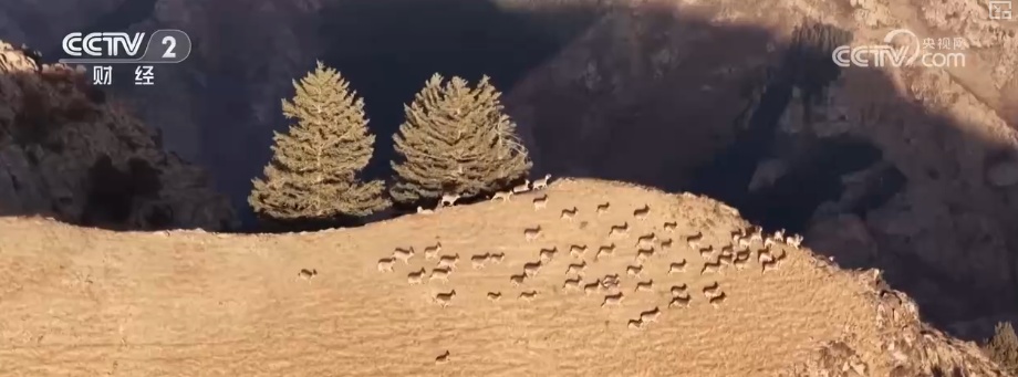 在画面里,数百只野生鹿群与岩羊群在草原上集群活动,与夕阳和祁连雪山一起构成一幅美丽的生态画卷。