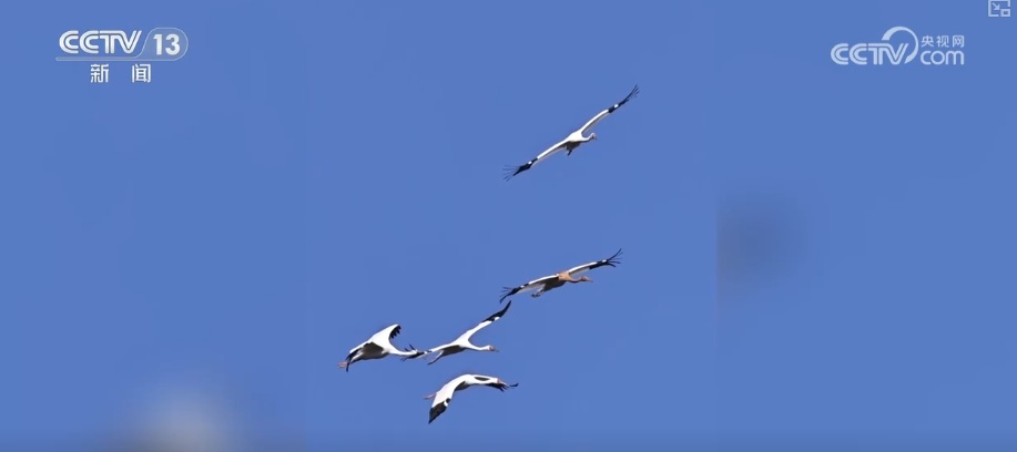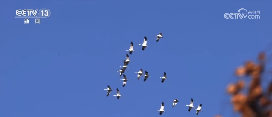 画面显示,这群白鹤在清晨的阳光下排成壮观的队形,它们悠长的鸣叫与翩跹的姿态,为天泉湖的秋日晨景增添了一抹灵动的生机。