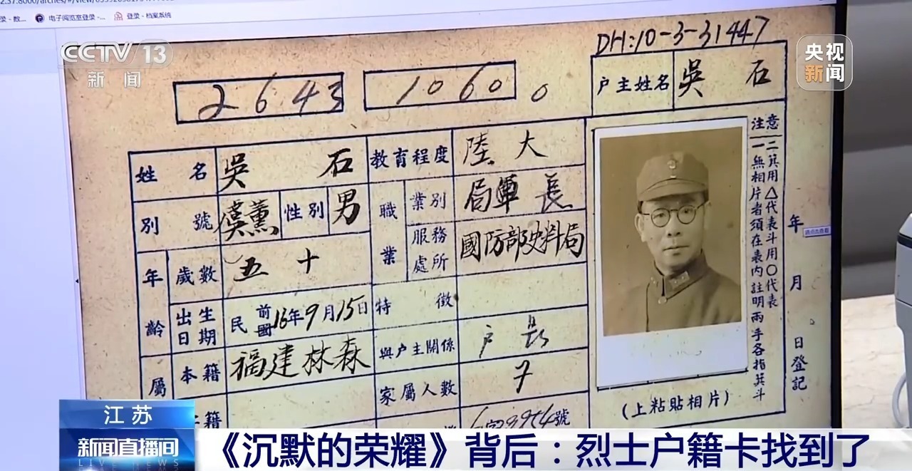 随着电视剧《沉默的荣耀》热播,牺牲在台湾的吴石等烈士引发广泛关注。近日,南京市档案馆找到了吴石、陈宝仓、聂曦及家人的户籍卡,以及当年的照片。这批跨越70余年的珍贵史料,清晰记录了他们在南京工作期间的职业身份等信息。