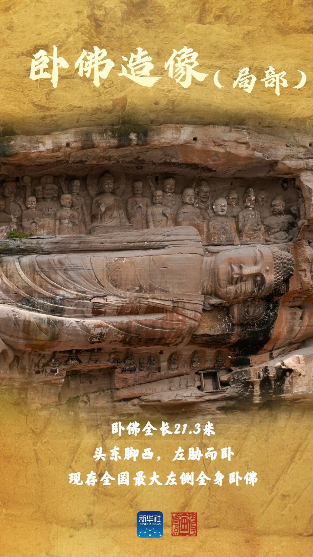 卧佛龛的造像依山取势、大胆创新,由三组构成:上面一组为释迦牟尼涅槃前的说法图,中间一组为释迦牟尼左侧卧佛造像,下面一组为善财童子五十三参造像。