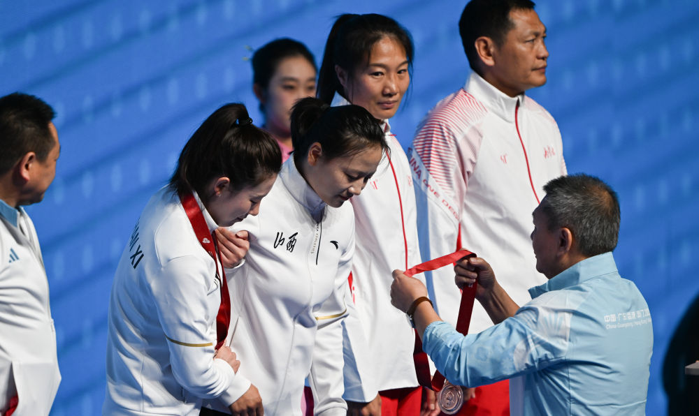 ↑ 季军山西队选手赵春媛(中)在颁奖仪式上。 新华社记者 杨冠宇 摄