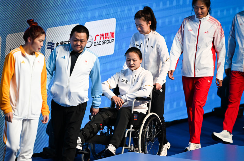↑ 获得并列季军的赵春媛(中)坐轮椅参加颁奖仪式。 新华社记者 杨冠宇 摄