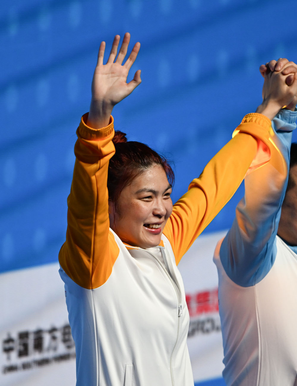 ↑ 禹立赛(右)在夺冠后庆祝。 新华社记者 杨冠宇 摄