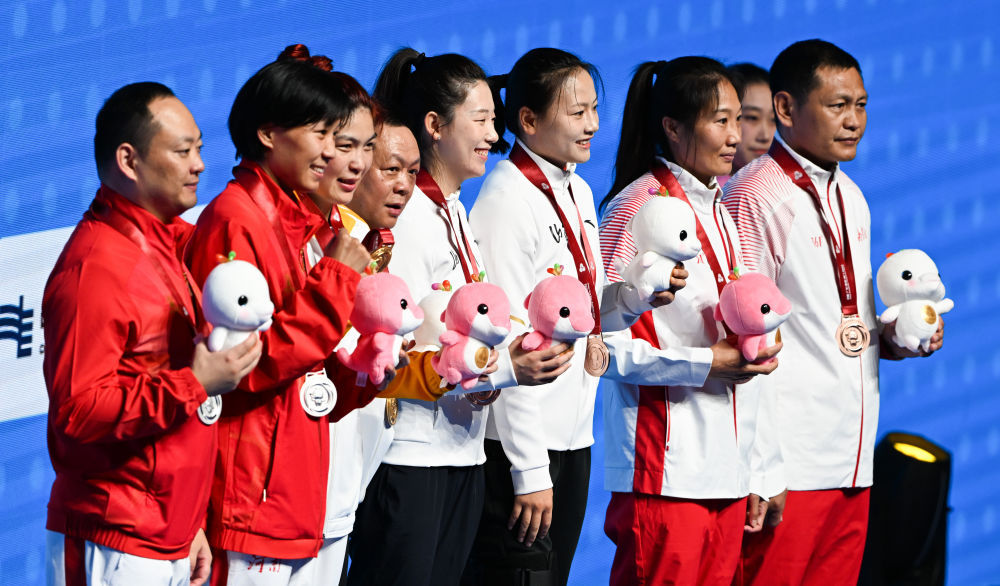 ↑ 冠军北京体育大学队选手禹立赛(左三)、亚军河南队选手李书(左二)、季军山西队选手赵春媛(右三)、季军内蒙古队选手杨柳(右二)与教练员在颁奖仪式上合影。 新华社记者 杨冠宇 摄