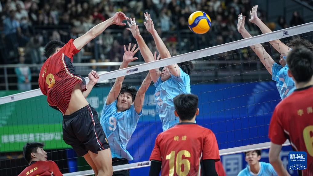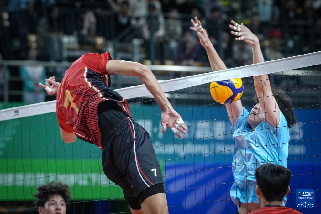 11月12日,河南队球员李旭阳(上右)在比赛中扣球。