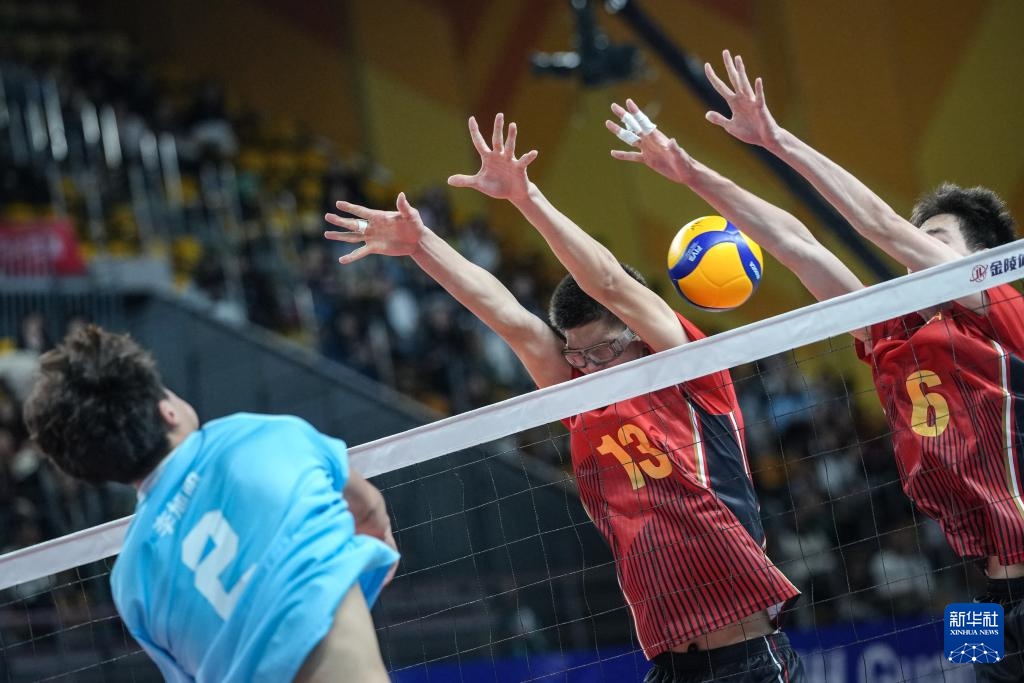 11月12日,山东队球员杨玉泽(中)、李海(右)在比赛中拦网。
