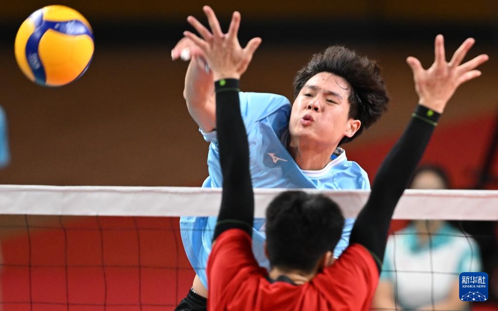 11月12日,山东队球员张智强(右)在比赛中扣球。