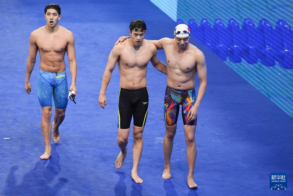 11月12日,中国公安体育协会队选手季新杰(右)与浙江队选手潘展乐(中)在比赛后。他们分别获得亚军、季军。