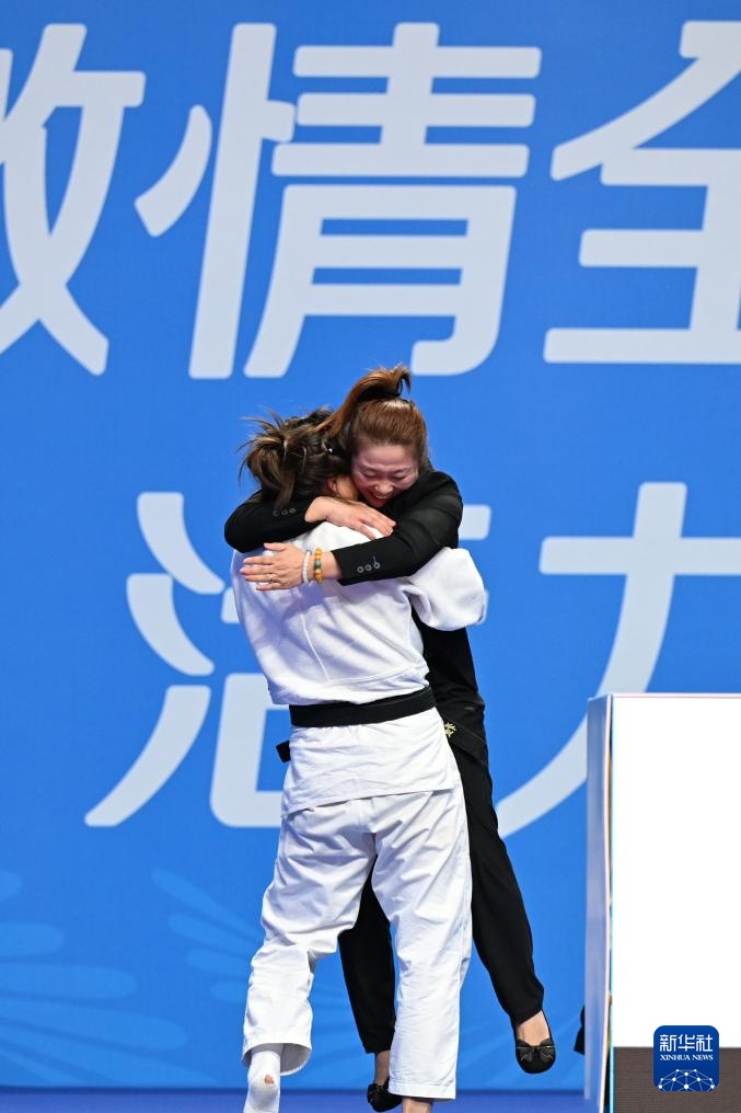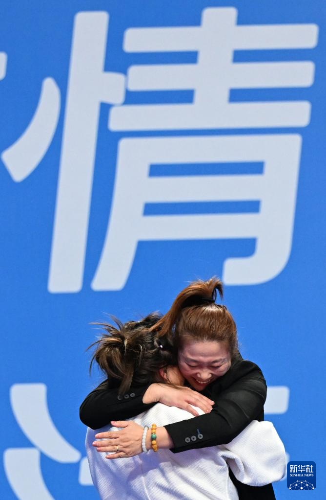 11月12日,广东队选手刘毅(左)在女子78公斤级金牌赛中获胜后与教练拥抱庆祝。