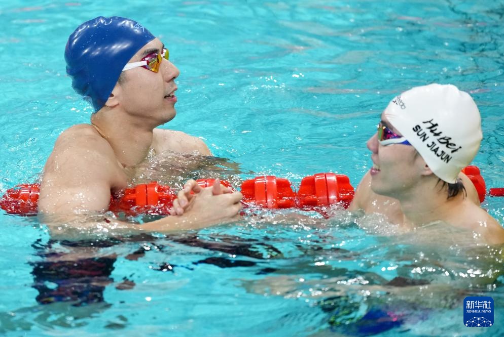11月12日,湖北队选手孙佳俊(右)与队友闫子贝在比赛后握手致意。他们晋级决赛。