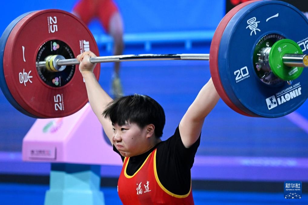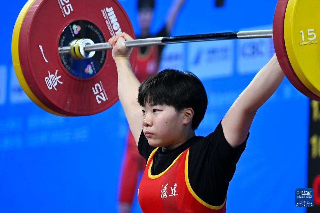 11月12日,福建队选手杨柳月在抓举比赛中。