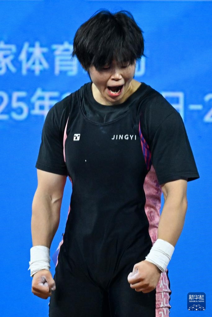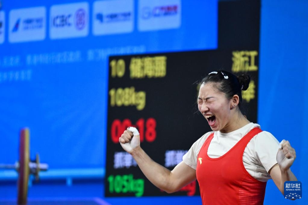 11月12日,浙江队选手储海丽在抓举比赛中试举成功后庆祝。