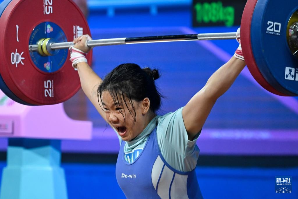 11月12日,成都体育学院队选手方淋在抓举比赛中。