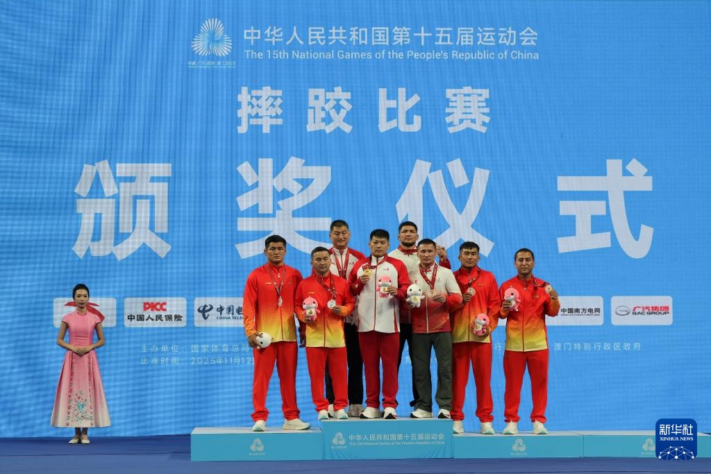 11月12日,获得冠军的山东队选手杨超强(左五)、获得亚军的新疆队选手哈比拉·阿吾萨衣满(左二)、获得季军的甘肃队选手木黑特·吐尔逊别克(右四)、获得季军的新疆队选手阿不里孜·买开(右二)和教练在颁奖仪式上合影。