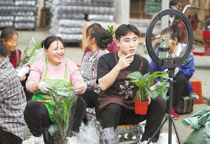 11月11日,钟祥市柴湖镇花卉产业园内,村民们忙着对各类花卉进行养护、采摘,随即打包、装车,销往上海、杭州等城市。