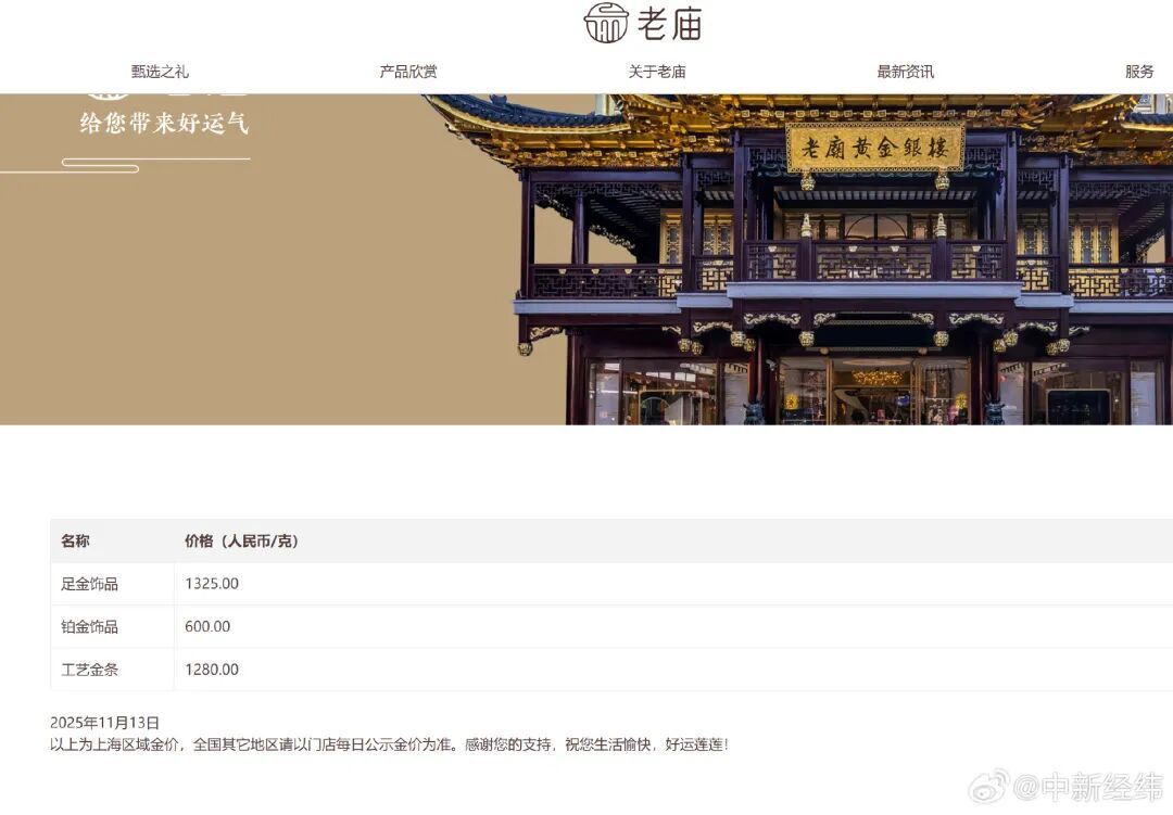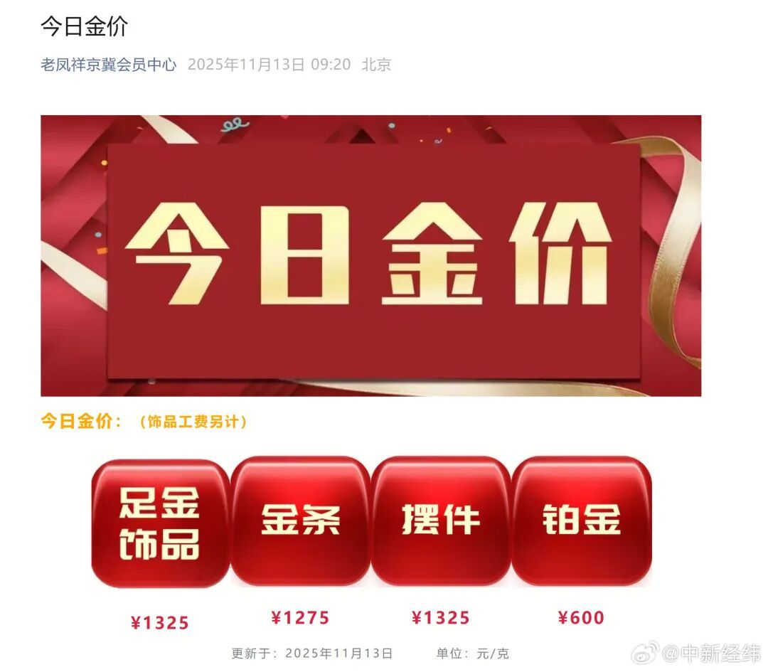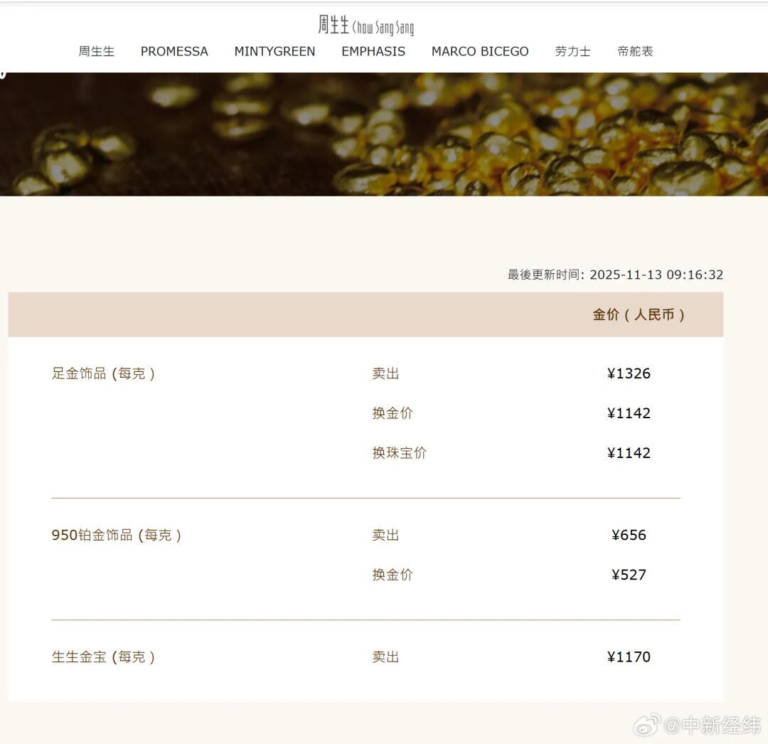 11月13日,中新经纬查询到,周生生金饰价格为1326元/克,较前一日1309元/克上涨17元/克。 老庙黄金金饰价格为1325元/克,较前一日1310元/克上涨15元/克。老凤祥金饰价格为1325元/克,较前一日1310元/克上涨15元/克。