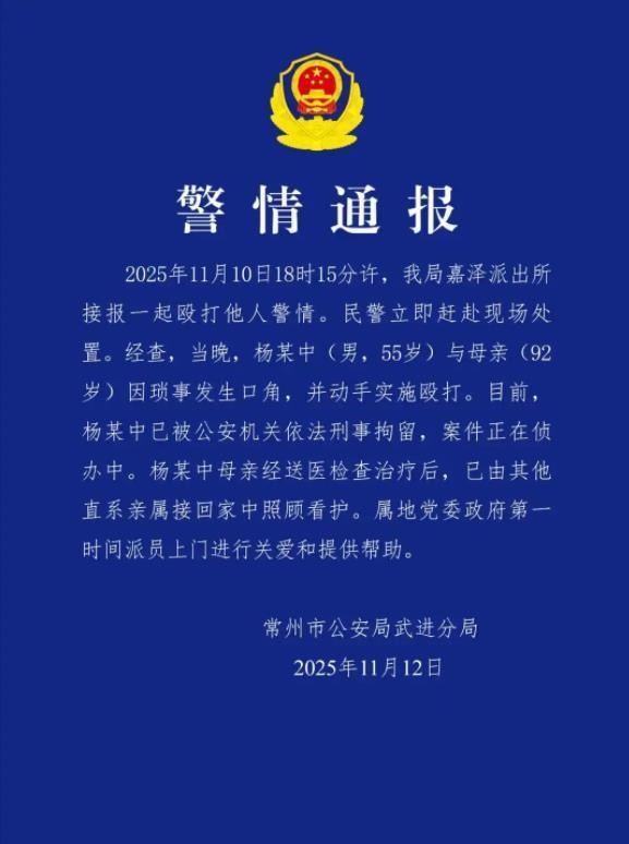 11月10日,流传在网上的一段视频显示,一名男子绕过桌子,一手拿着手机,另一只手对一位红衣白发老太太连续实施击打面部、揪头发、摇晃等,力度十分猛烈。老人难以躲避,接着发出“哎哟”叫声,并险些摔倒。随后,老人走到厨房,男子跟随过去,将老人推倒在地,并使劲按压。据江苏武进警方通报,杨某中已被刑事拘留。(据11月12日红星新闻报道)