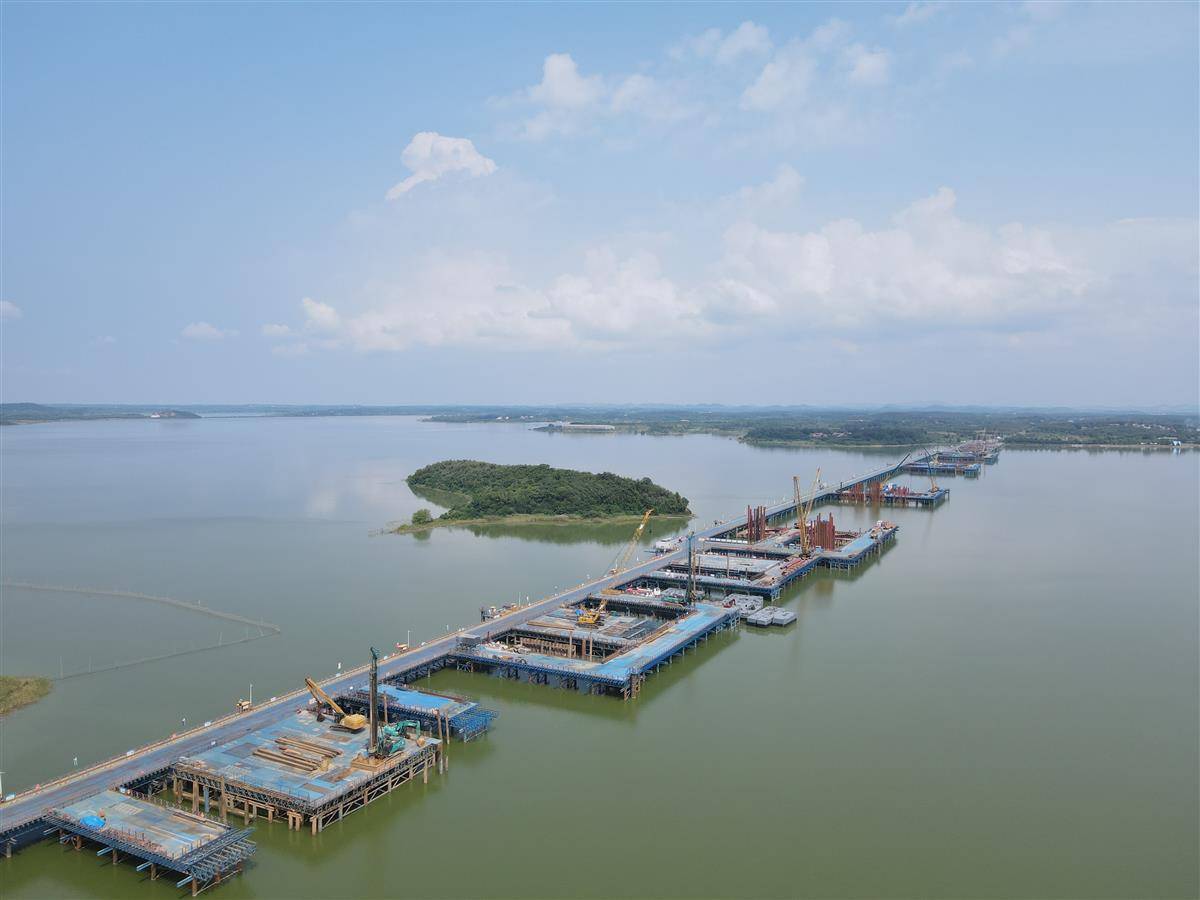 “以前S122公路就修到这里,对面也修到那儿了,中间就差湖上这一段,过不来。”中交中南局天子山大桥项目生产经理齐俊鹏指着湖面说。
