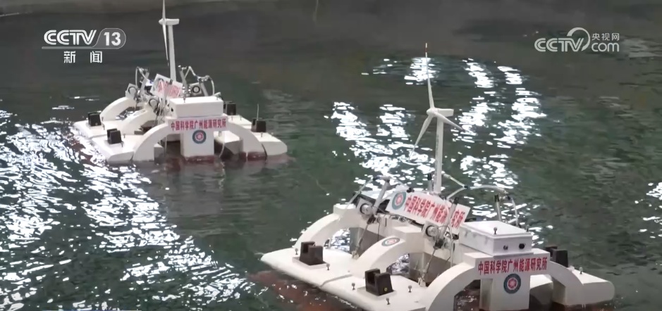 实验水池中,三组装置正在模拟的海洋环境中起伏运转。这些装置并非随意摆放,而是以特定阵列组合,探索风能与波浪能如何协同发电。国家海洋技术中心高级工程师王花梅介绍,三套装置组成一个小的阵列单元,探究阵列不同形式和阵列之间不同间距,来探索这个装置阵列什么时候性能最优,发电效率最高。