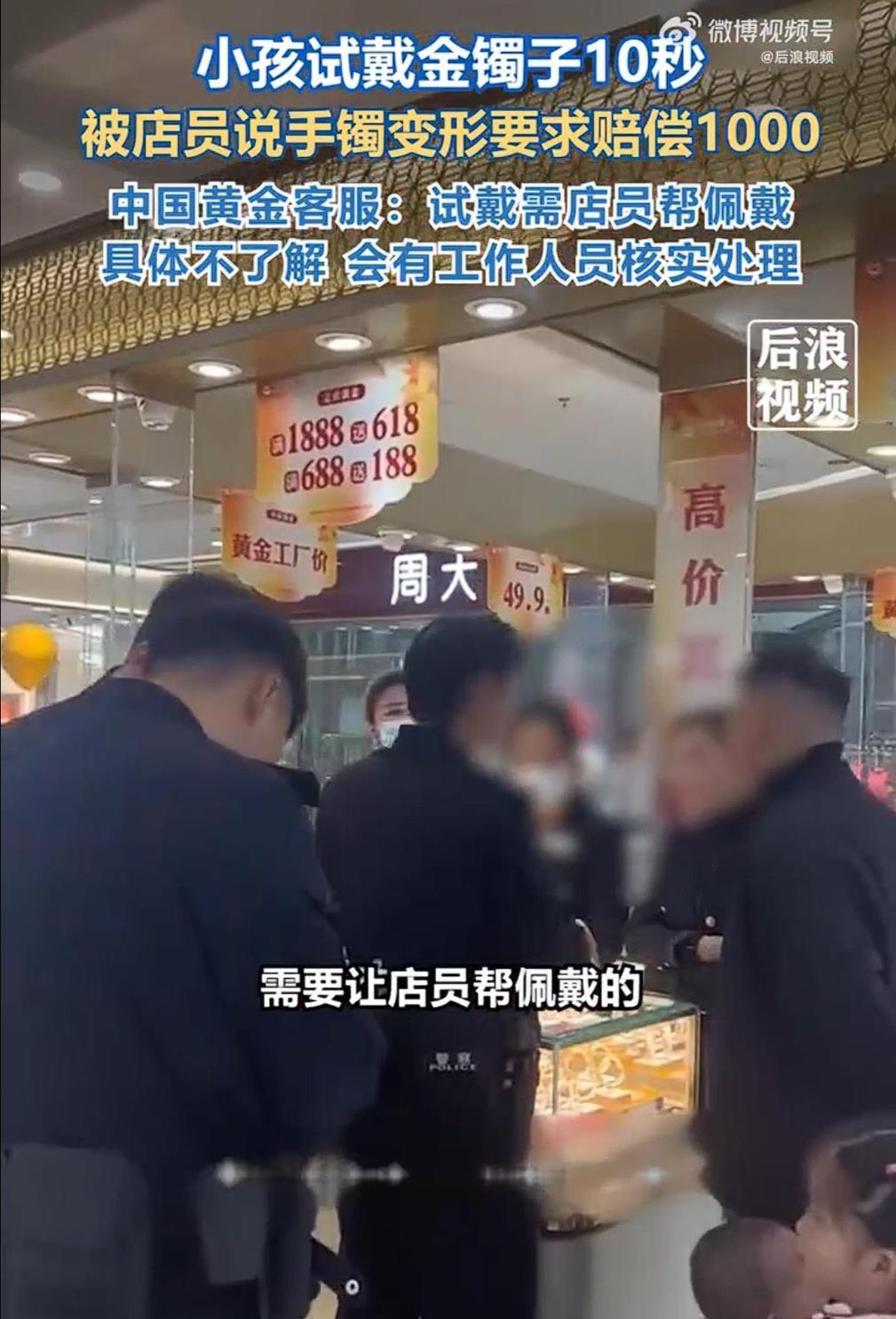 11月12日,据媒体报道,女子带孩子逛金店时,在营业员全程注视下试戴了一个黄金手镯,全程不超过10秒,取下来时营业员说手镯变形要求赔偿1000元,否则不让她们走。该女子表示,手镯太大,甚至都没怎么碰到孩子的皮肤,当地民警到场后也认为营业员的做法“可笑”。11月13日,中国黄金客服表示,店员都是有经过培训的,试戴需要店员帮忙佩戴,对于此事客服部不了解具体情况,具体会有工作人员核实处理。(据11月13日九派新闻)