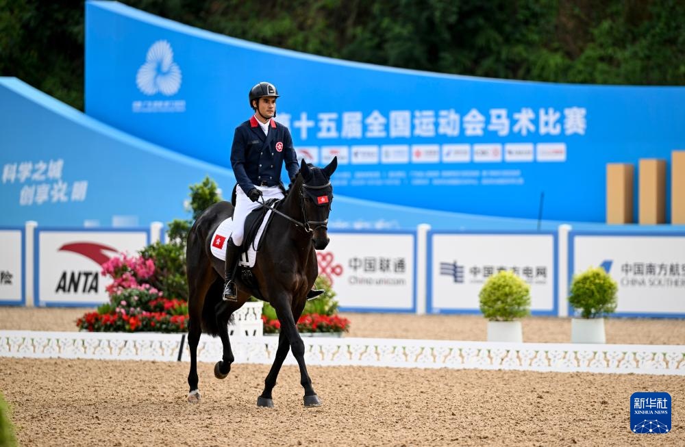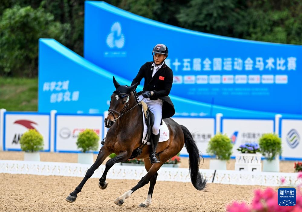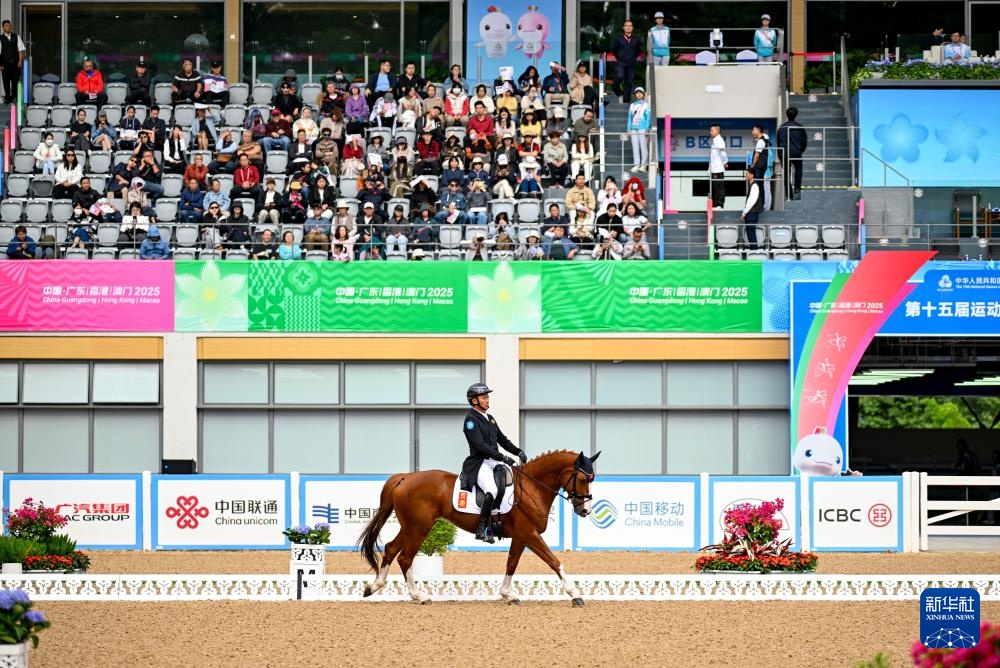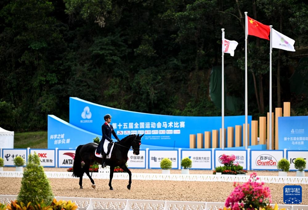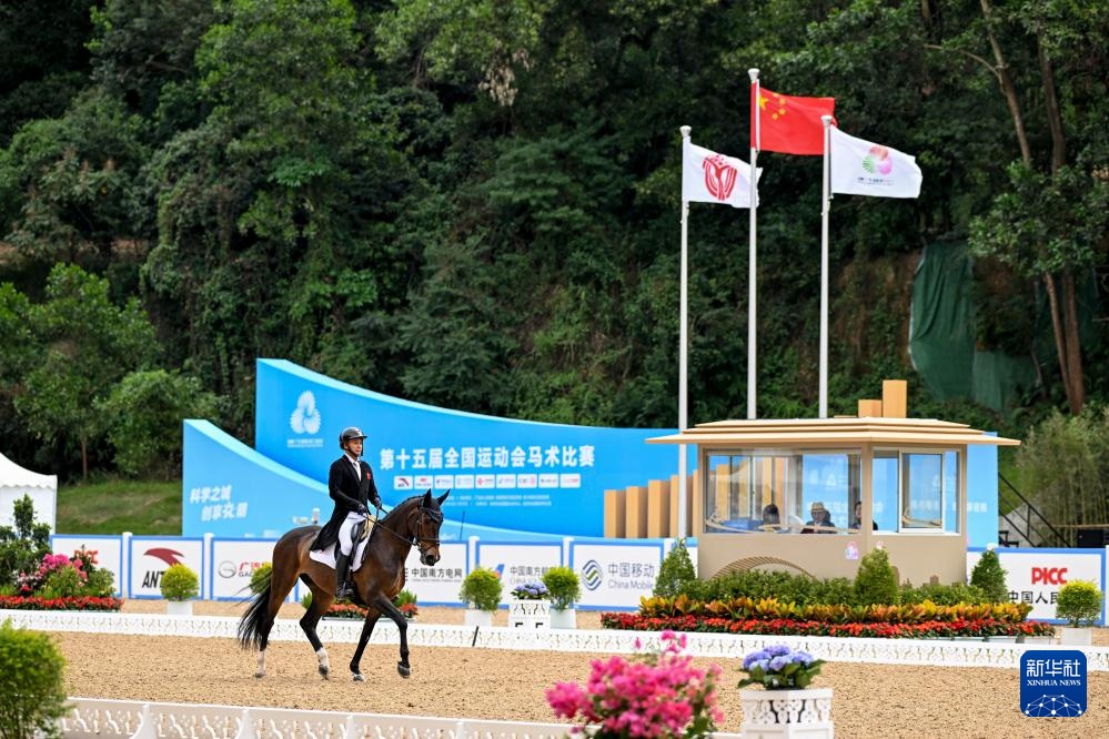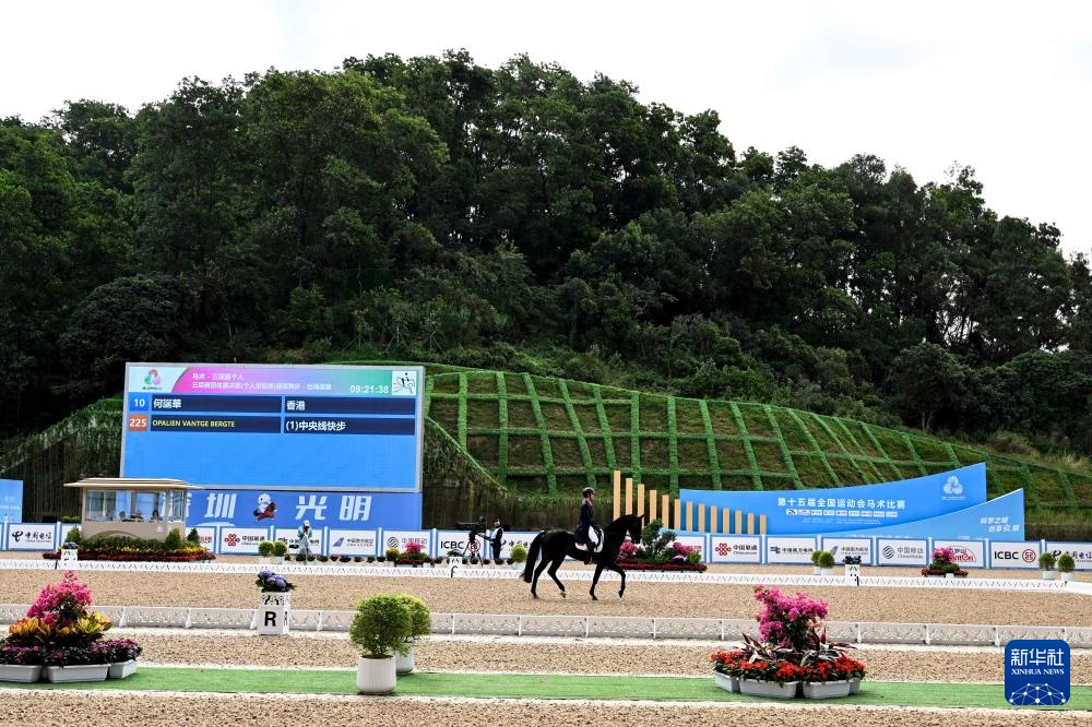 当日,第十五届全国运动会马术三项赛团体赛决赛(个人资格赛)盛装舞步在广东深圳光明国际马术中心举行。
