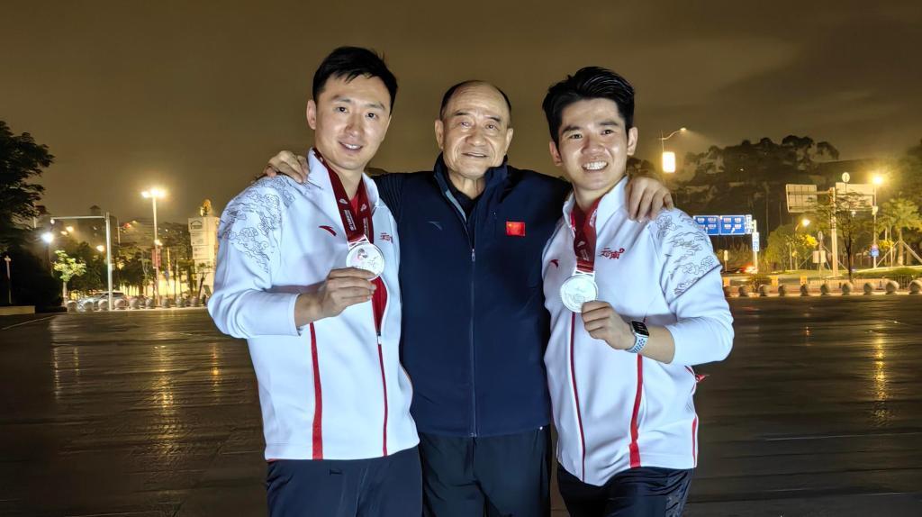 云南省武术协会主席胡宝林(中)和云南队选手余迪昊(右)合照。受访者供图