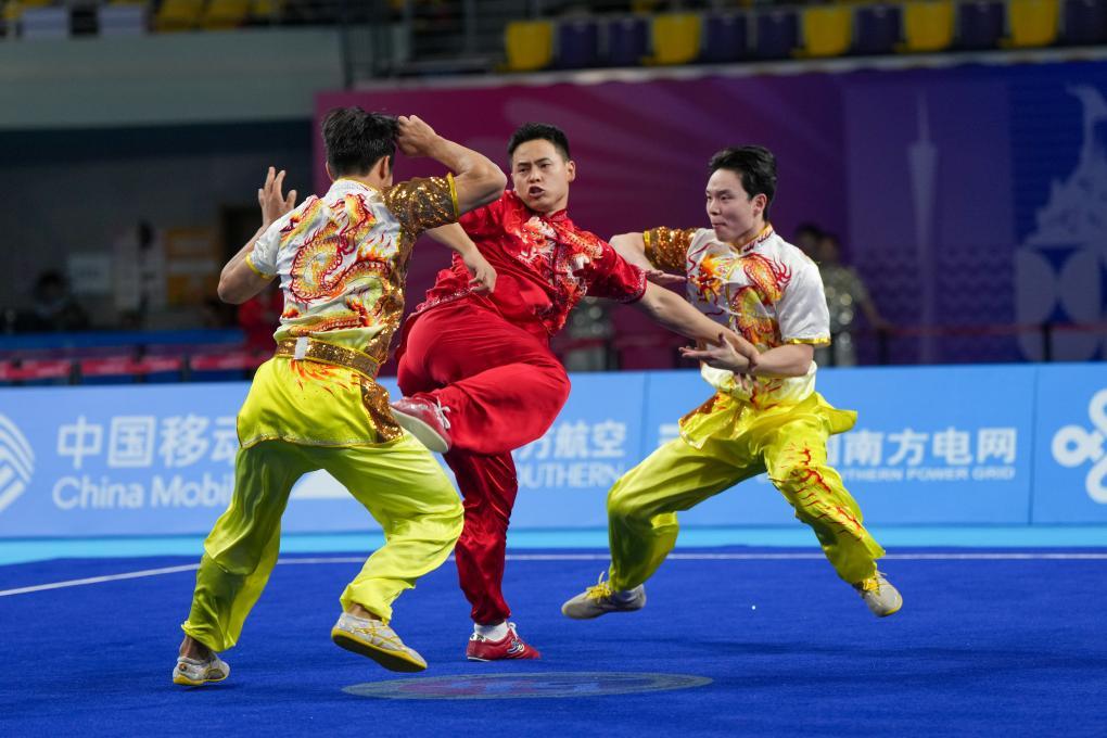 11月10日,重庆队选手颜亮、周先清、马鲁豫在团体赛男子三人徒手对练比赛中。最终,重庆队获得总分第四名。新华社记者 晋美多吉 摄