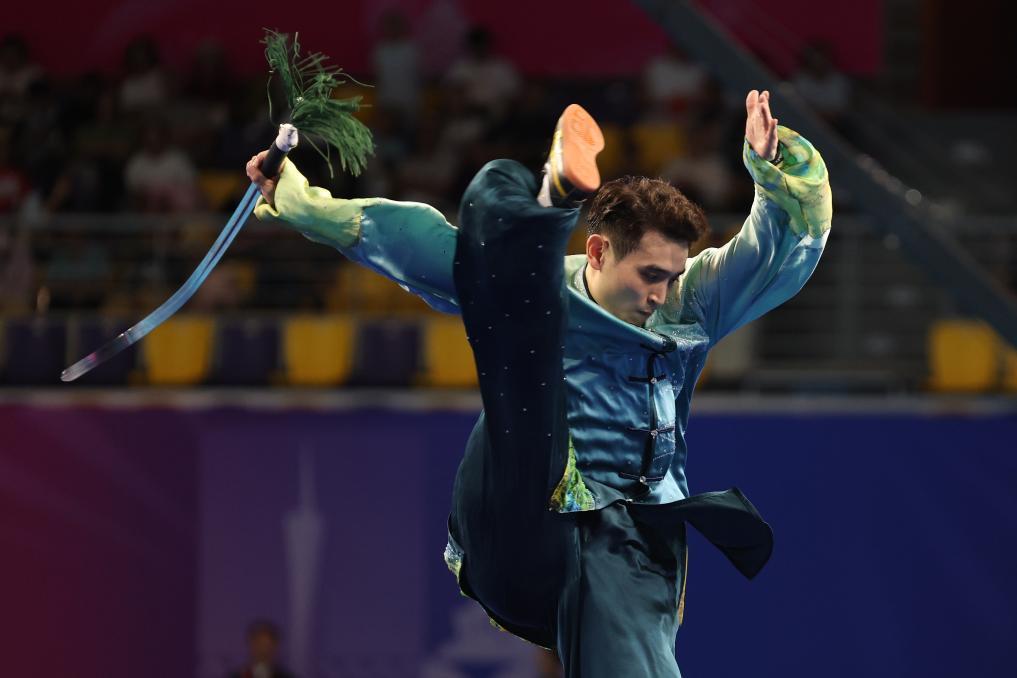 运动员完成腾空飞脚接外摆莲接雀地龙等高难度动作前