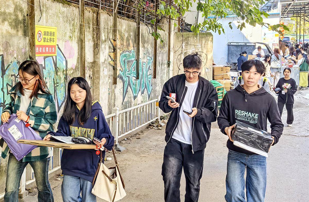 11月13日,文华学院校园内处处可见拿民间快递的学生。
