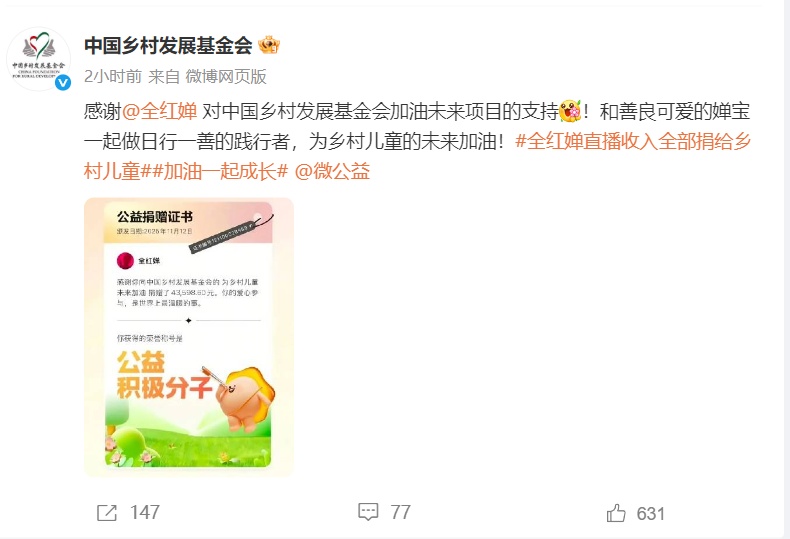 11月13日,中国乡村发展基金会发文:感谢全红婵对中国乡村发展基金会加油未来项目的支持!和善良可爱的婵宝一起做日行一善的践行者,为乡村儿童的未来加油!