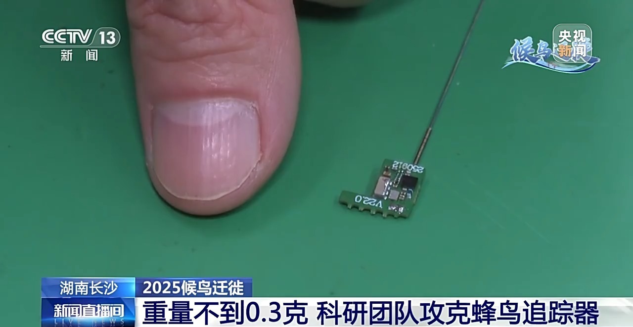 科研团队研发的最轻追踪器,大小仅仅小半个指甲盖,重量不到0.3克。按照小型候鸟追踪器,不超过记录个体体重5%的行业标准,现在它可实现对蜂鸟的追踪监测。