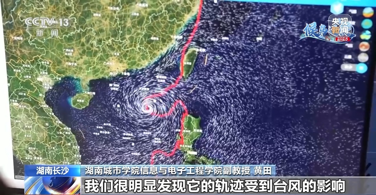 湖南城市学院信息与电子工程学院副教授 黄田:把它的轨迹和气象数据叠加之后,发现它的轨迹受到台风的影响,发生明显的一个偏移。整个绕飞的距离有1000多公里。