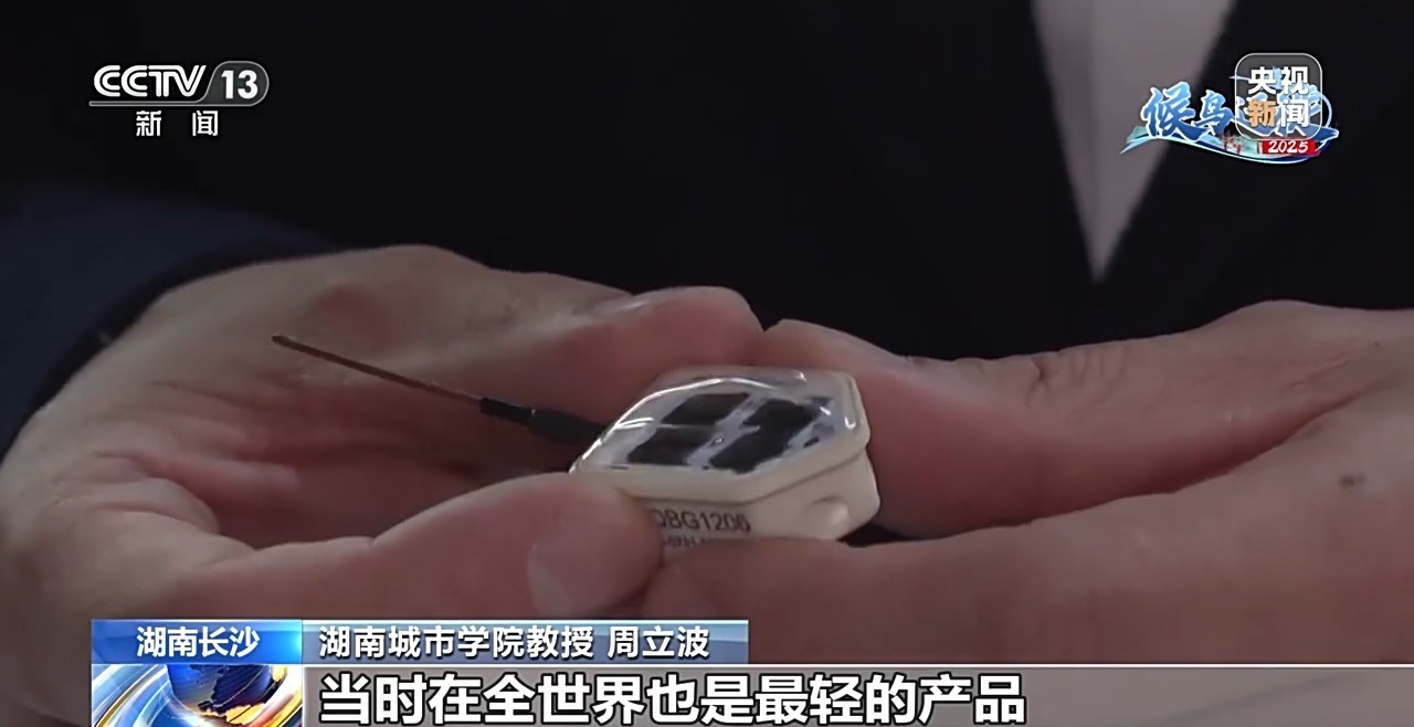 湖南城市学院教授 周立波:在“十四五”初期,我们的卫星追踪产品最小的就是我手上这个产品,大概是6克的样子,当时也是全世界最轻的产品,它具有太阳能供电、卫星定位、手机网络信号传输的功能,能在野外工作3到5年。现在我们最轻的追踪器现在已经做到了0.3克。我们新研发的这套技术,它能够做到0.1克的追踪器,这一步马上就会突破。