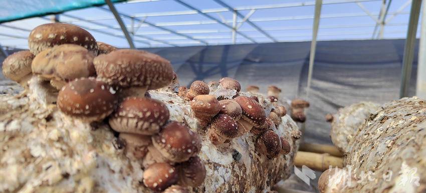 关店村香菇种植基地,一簇簇香菇从菌棒上探出“脑袋”。