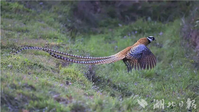 11月13日,广水市中华山林场深处,杉木与栎木交织。一声清越的啼鸣划破寂静,护林员陈文杰循声望去,一只雄性白冠长尾雉振翅而起,在林间划出一道华丽的弧线。