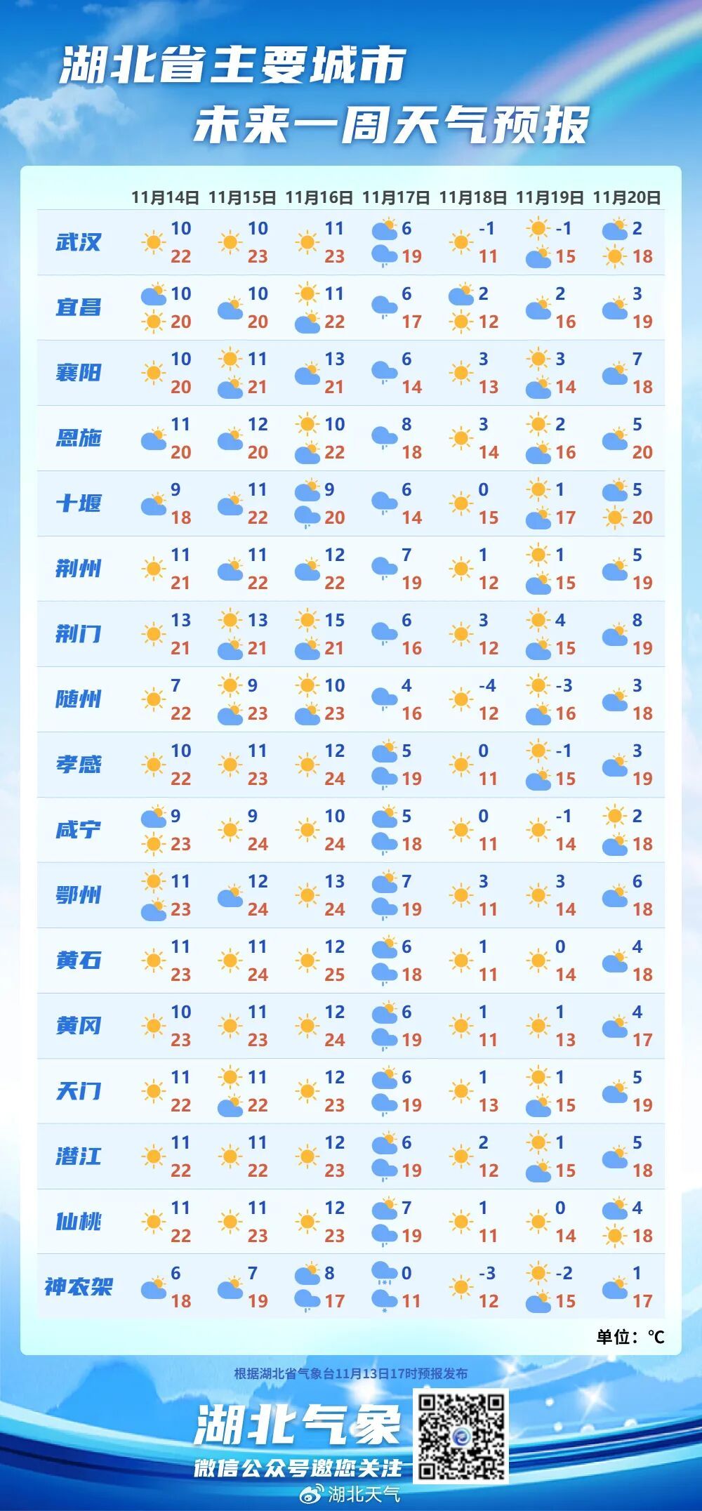 【温馨提示】预计此轮较强冷空气携风雨雪前来,气温开始“断崖式”下降,18日起省会武汉、神农架、随州、孝感等地最低气温将陆续跌至0℃或以下,最高气温也仅10℃出头。冷暖明显转换,公众需注意气温变化,及时调整着装,以免着凉感冒。