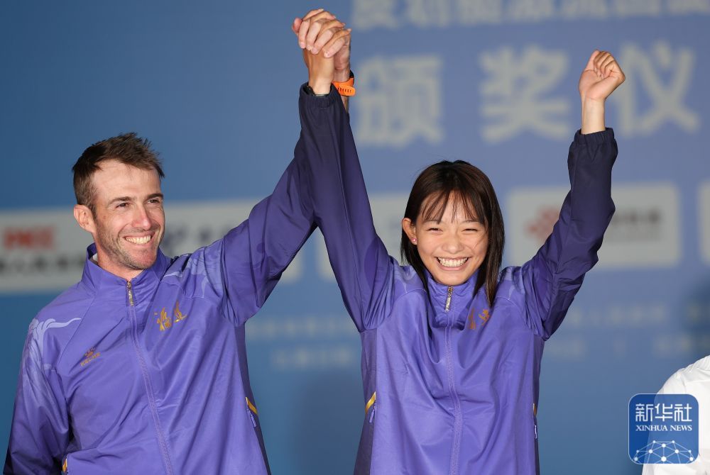 ↑ 冠军福建队选手李诗婷(右)在颁奖仪式上和教练庆祝。 新华社记者 黄伟 摄