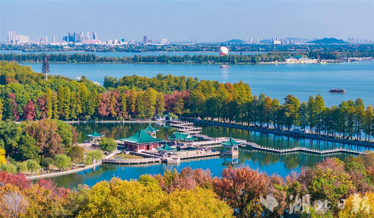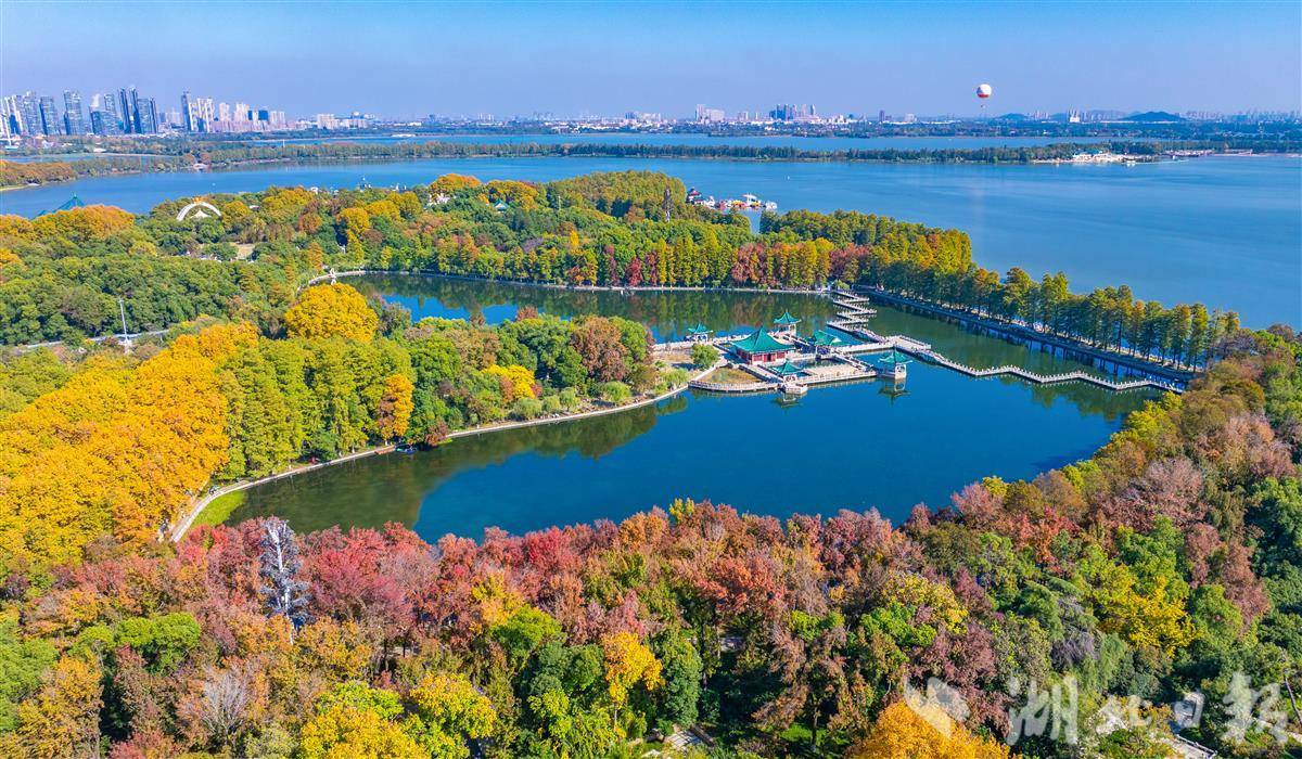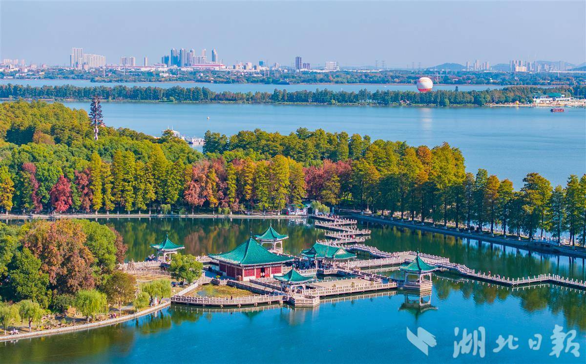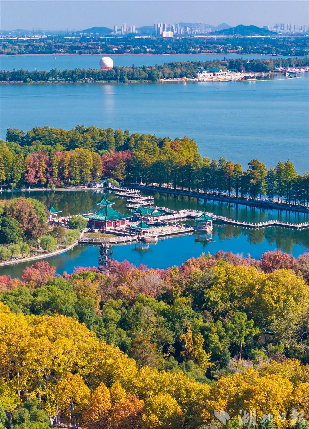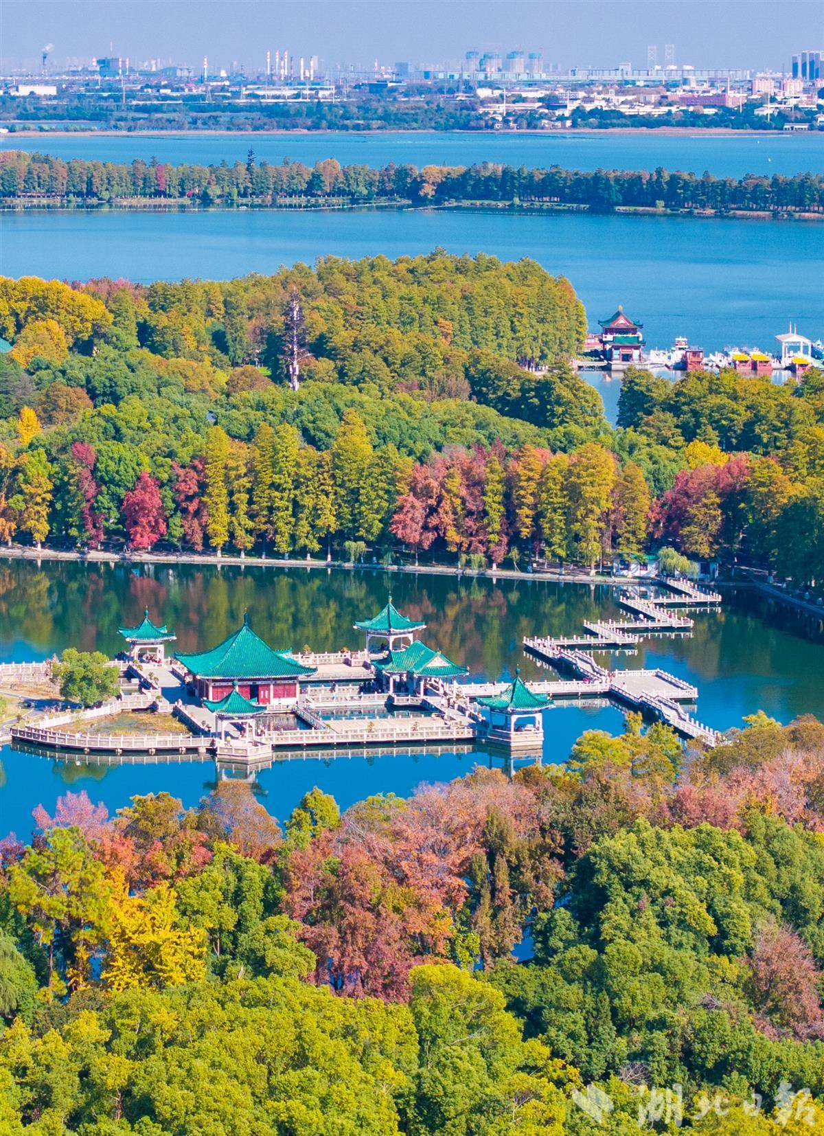 11月13日,武汉东湖风景区层林尽染,红枫、乌桕、银杏等树木色彩斑斓,与亭台轩榭相互映衬,构成一幅美丽的生态画卷。