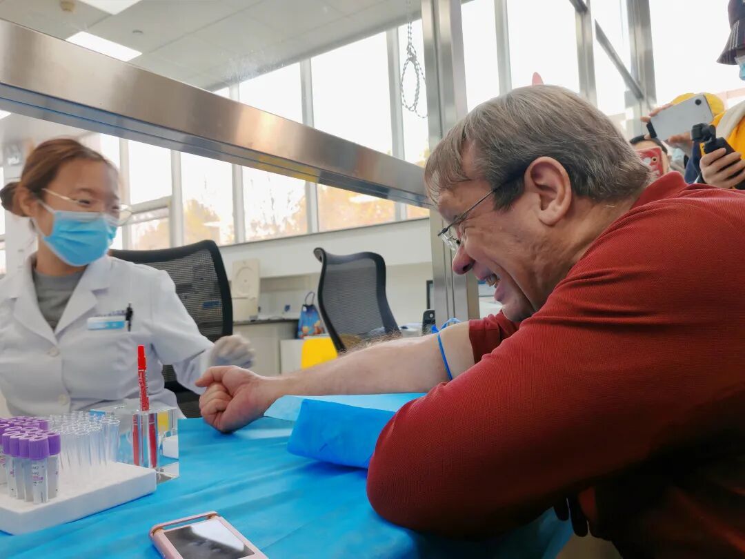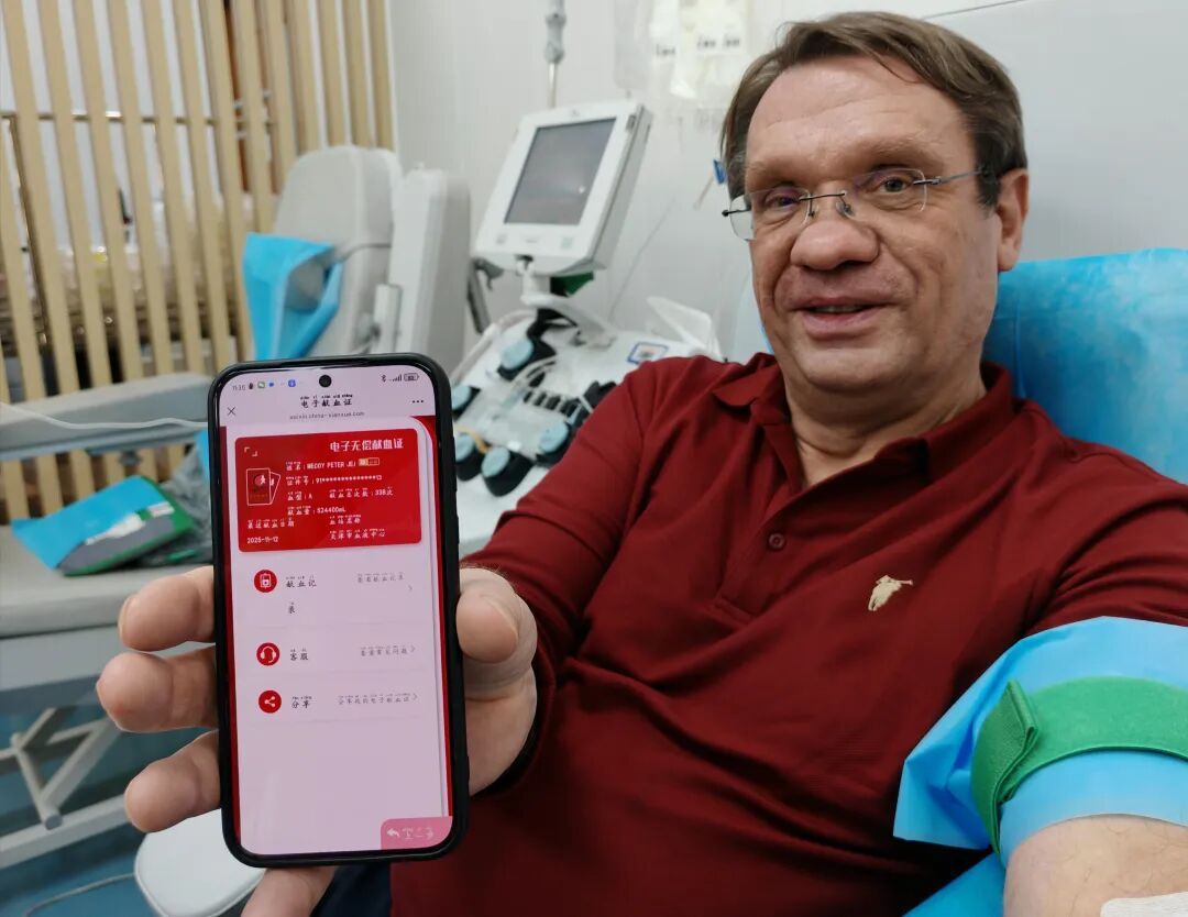 今年已满60周岁的老皮是澳大利亚人,中文名叫皮安睿。从2008年起,连续17年,累计捐献机采血小板 333次、653个治疗单位,捐献全血5次、2000毫升,曾获全国无偿献血奉献奖终身荣誉奖。