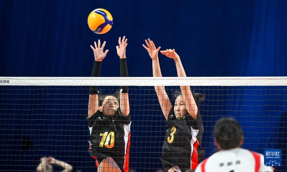 11月13日,河南队球员李紫含(左)、许静雨在比赛中拦网。