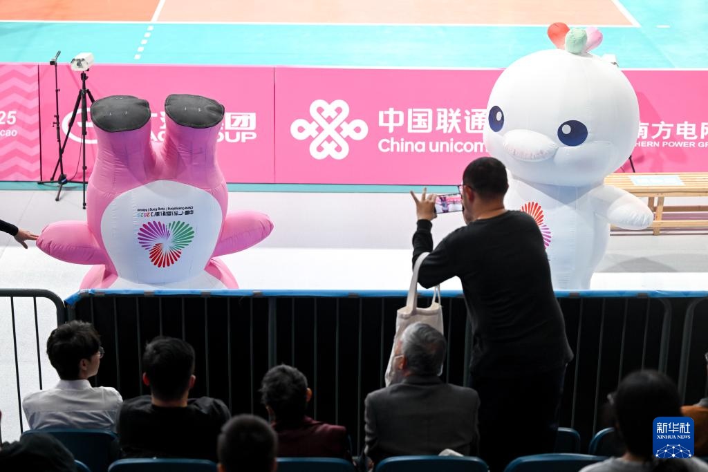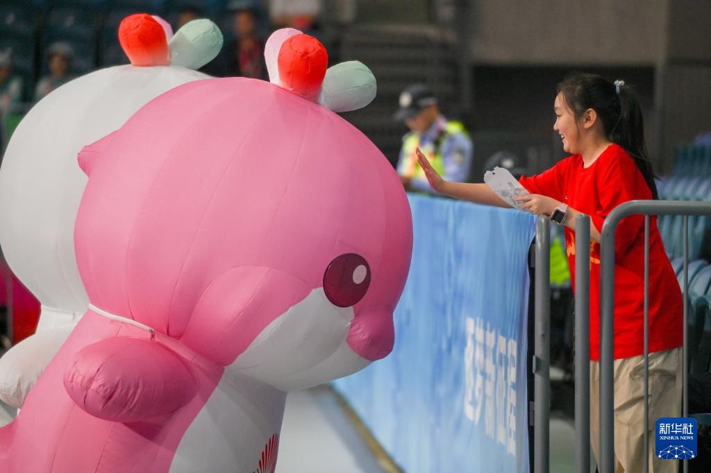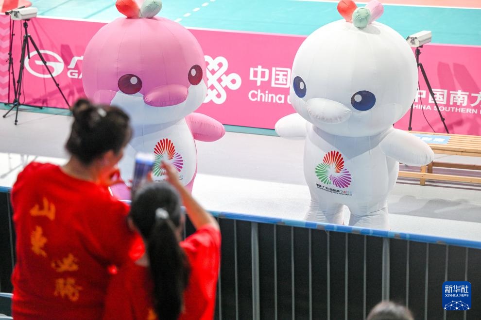 11月13日,本届全运会吉祥物在比赛开始前和观众互动。