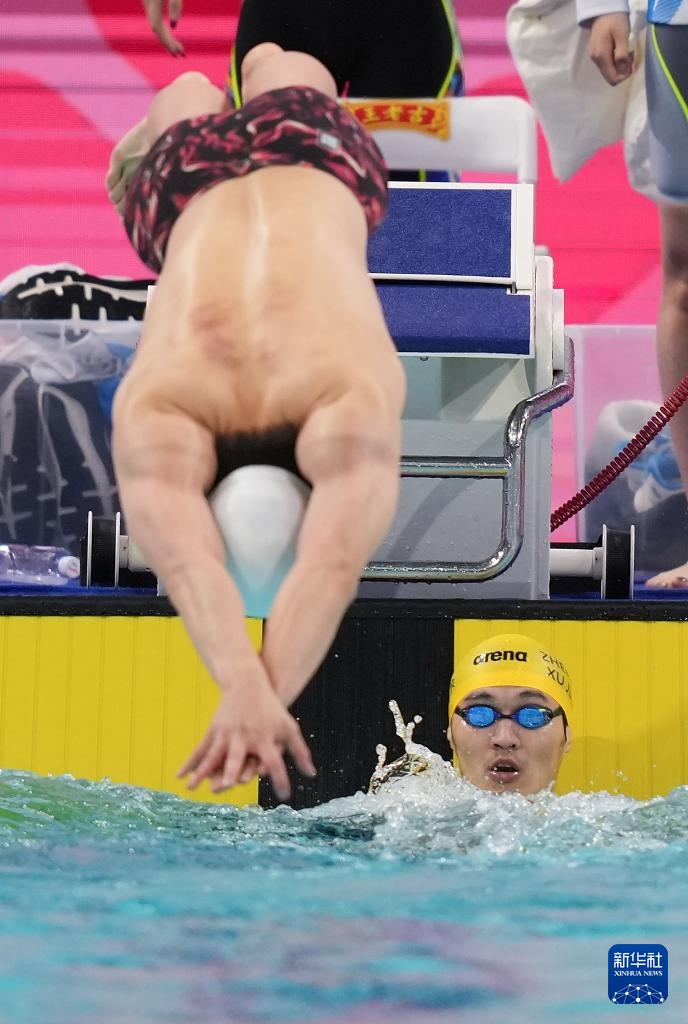 11月13日,浙江队第一棒选手徐嘉余(下)在比赛中注视第二棒选手谢以忱出发。最终,浙江队获得冠军。