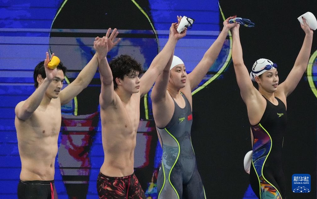 11月13日,浙江队选手余依婷(左一)、谢以忱(左二)、徐嘉余(右二)和吴卿风(下)在比赛后。浙江队获得冠军。