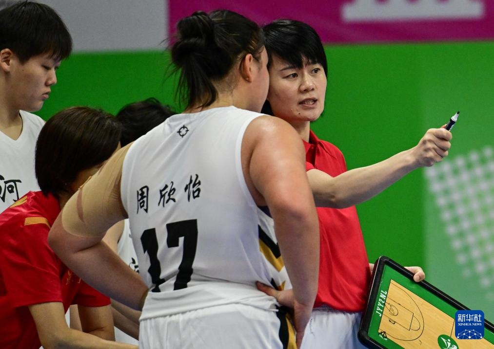 11月13日,河南队主教练宗星星(右一)在比赛暂停时布置技战术。