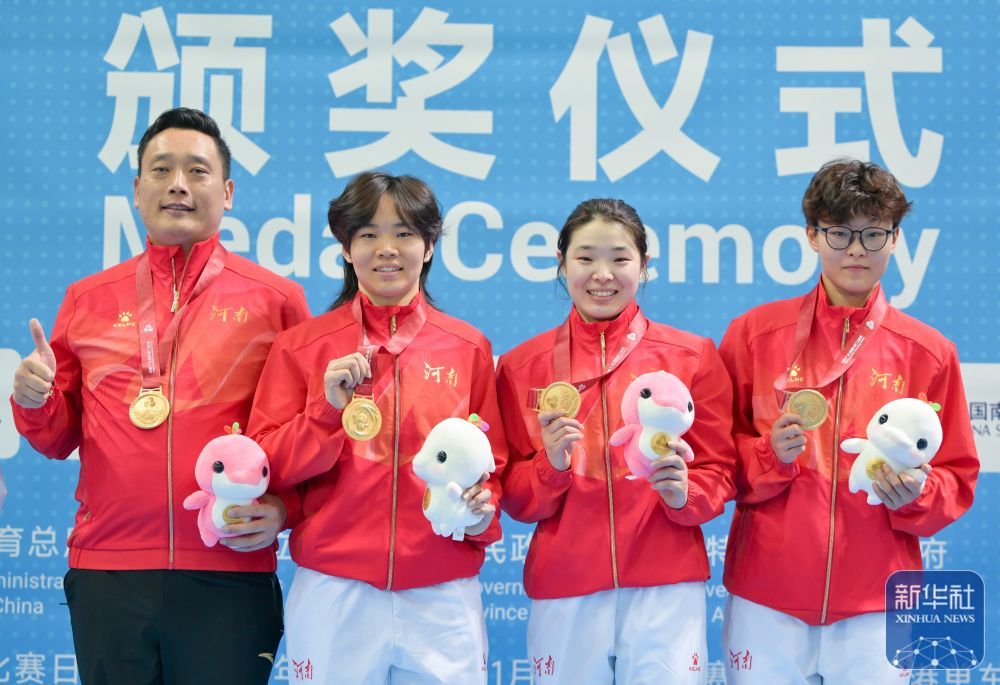↑ 冠军河南队选手鲍珊菊(左二)、郭裕芳(右二)、骆书艳(右一)和教练在颁奖仪式上合影。 新华社记者 胡虎虎 摄