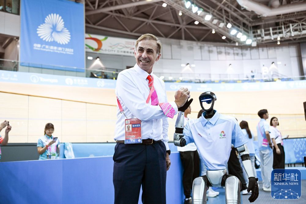 ↑ 一名赛事技术官员赛前同参与表演的机器人击掌合影。 新华社记者 胡虎虎 摄