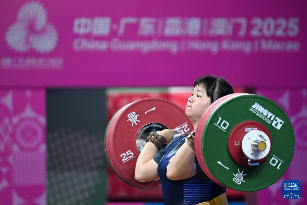11月13日,广东队选手彭翠婷在挺举比赛中。