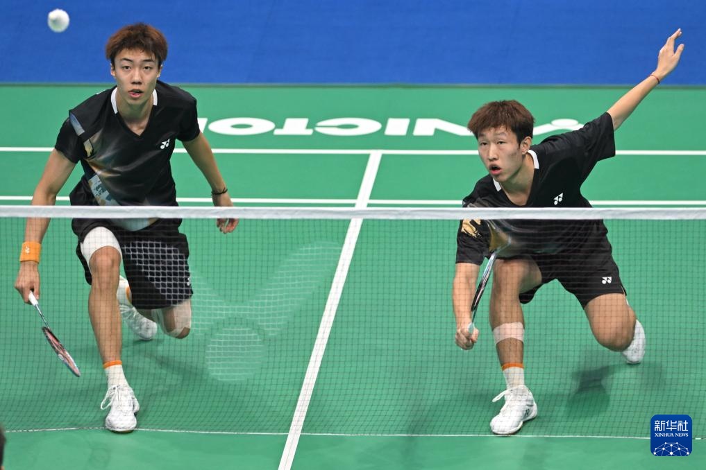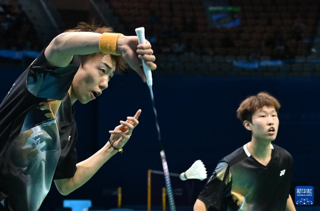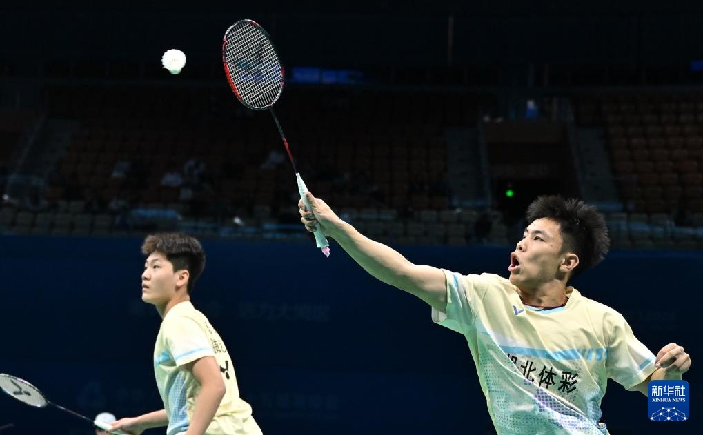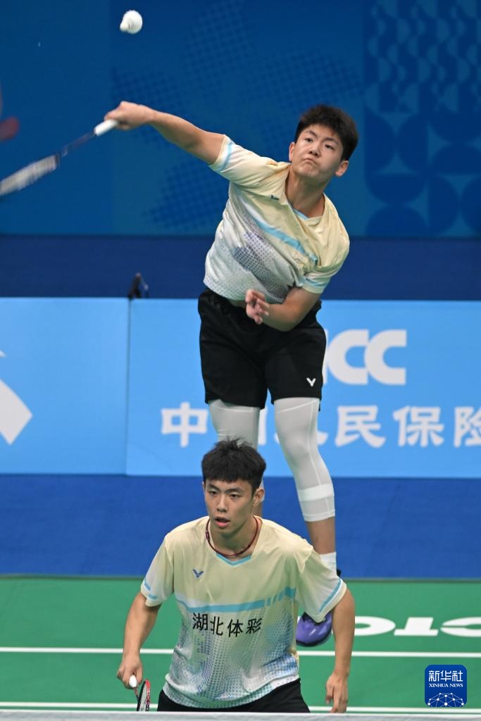 11月13日,湖北队组合屠懿宸/郑惟罡(右)在男双比赛中回球。他们1比2不敌山东队组合徐化雨/薛子煜。