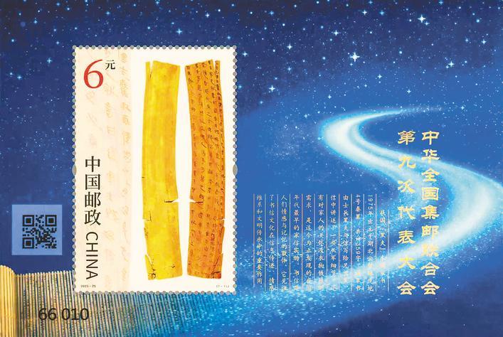 此次发行的邮票主图,选用湖北云梦睡虎地秦墓出土、现藏于湖北省博物馆的战国“黑夫”木牍家书。该木牍1975年出土于睡虎地4号秦墓,是目前考古发现的最早家书实物。该家书由士兵黑夫与惊写给兄长衷,信中讲述了一些从军细节,还有对家人的关怀及衣物钱粮的需求。邮票边饰背景中展开的竹简似一条时光长河,在象征中华文明的浩瀚星空里蜿蜒伸展,穿越千年、对话古今,蕴含着中华文明在传承中创新、在创新中发展的理念。